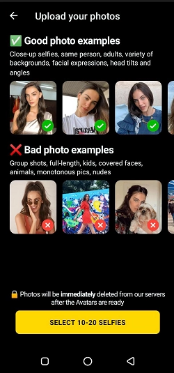 - Then upload and import your photos following the guidelines about which type of photos or selfies you can upload. You can select upto 20 selfies at one time from your gallery.