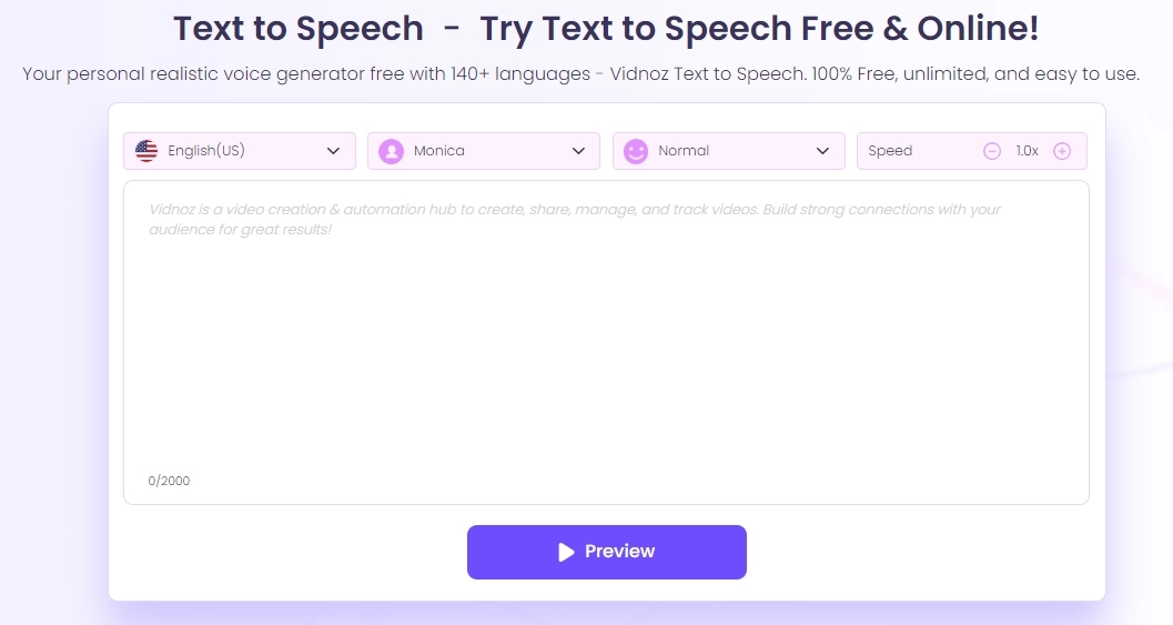 One of the most enticing aspects of Vidnoz Text to Speech is its free use. There are no hidden costs or subscription fees. You can access the tool online without installing any software or plugins. It provides a hassle-free experience, allowing you to generate voice-overs without any cost.
