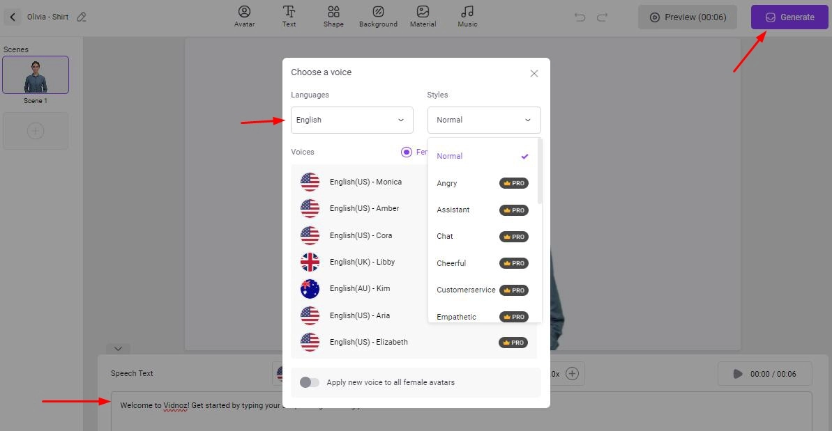 Before generating the voice-over, Vidnoz Text to Speech allows you to customize the voice settings according to your preferences. You can fine-tune parameters such as voice type, language, and speed. And then generate the voiceover for 100% free. what's more, Vidnoz also an AI voice changer to offer you more choices when you need to make AI voice over free. Multiple celebrities' voices are waiting for you try.