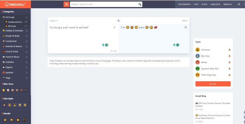 Emojiall translator is also a great emoji translator that allows you to translate text into emojis and emojis into text as well. This AI emoji translator enables you to translate emojis to and from texts in over 21 languages. There are trending topics and categories displayed on the sidebars as well. Furthermore, you can choose the hairstyle, skin tone, gender, and sentiment of the generated emojis.