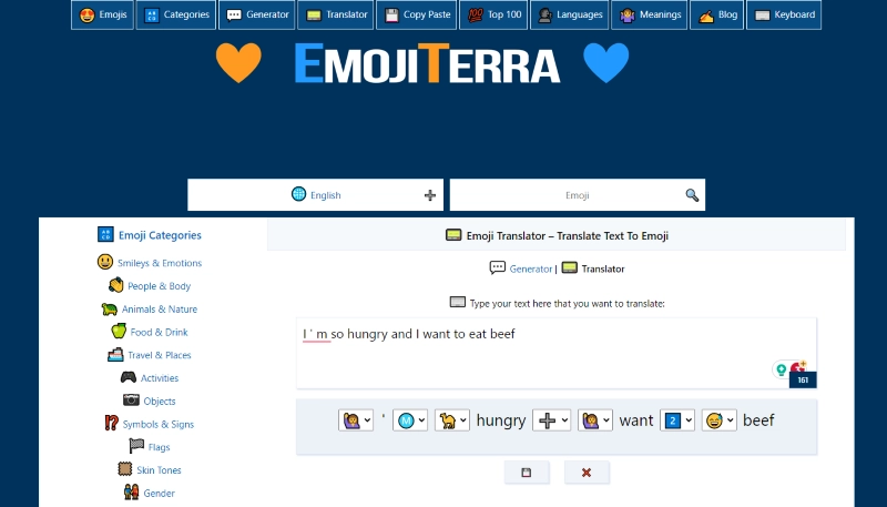 EmojiTerra is selected to be one of the best emoji translators for its enormous amount of emoji categories and amounts. There are 100+ languages and 3782 emojis listed. There’s also an emoji generator that can transfer any text you enter into emojis, though not in a sentence way, one text per time.