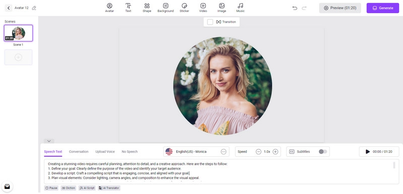 Step 4. Now you can use the editing options on this free AI video generator freely. Change the talking photo file size to be Circle or Square head as your talking avatar or use the full photo. Enter speech text manually or make use of the AI Script tool. Change the video background color, add text and music to the video, and make a mixture of other media elements to give your video a personalized look.