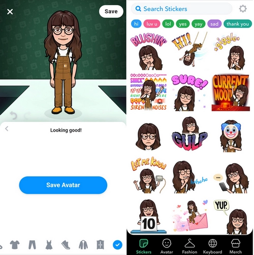 On the Bitmoji app, users can create cartoon avatars from their photos. This app also allows users to edit the avatar by changing clothes, hairstyles, skin colors, clothes, backgrounds, etc. Besides adjusting facial and character features, users can further make animated stickers and create a Bitmoji featuring their appearances and share these unique emoji on the Snapchat app directly. A seamless integration is supported between the two apps.