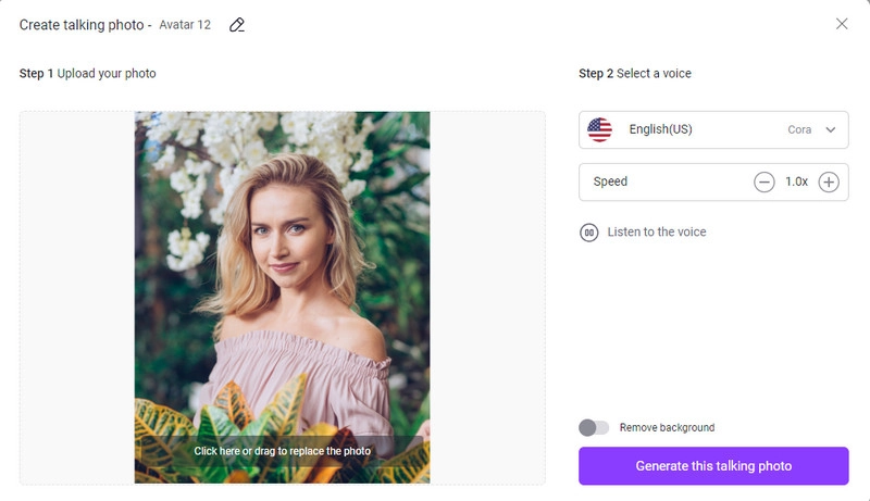 Step 3. Select an AI voice for your talking photo. You can preview each voice to decide on final vocie. If the voice is ok with you, click Generate this talking photo.