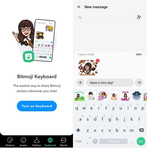 Step 5. Enable Bitmoji keyboard. Bitmoji provides a step-by-step guide to help you do it easily. Now you can share your Bitmojis on other chat and social media apps. Just switch to the Bitmoji Keyboard on those apps and tape the Bitmoji you want to send.