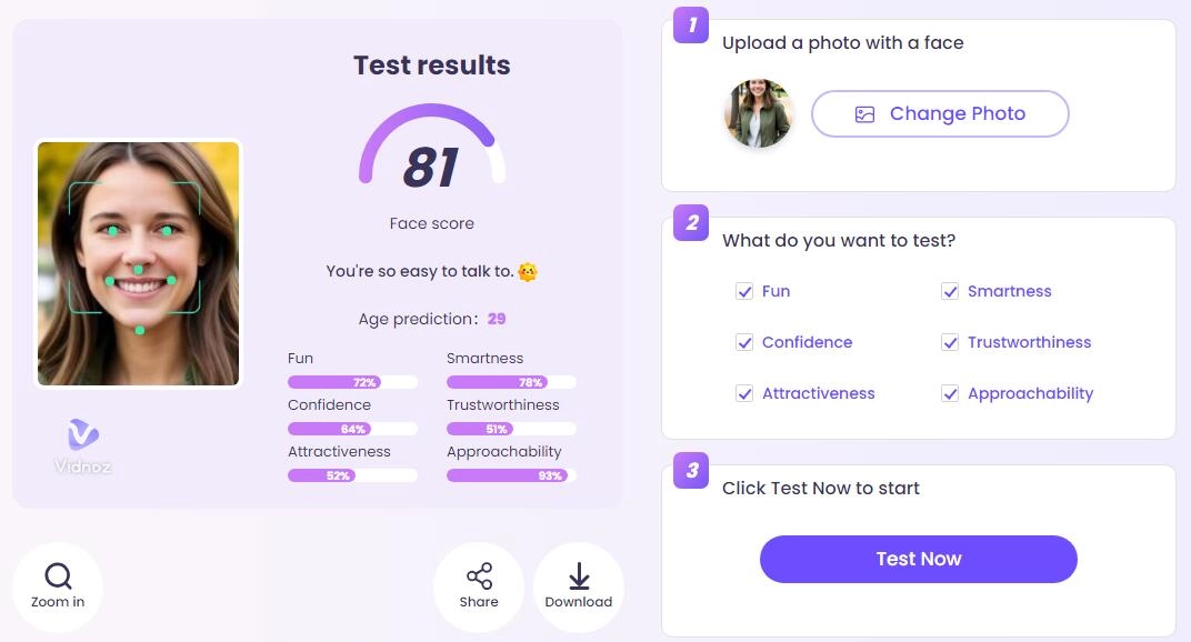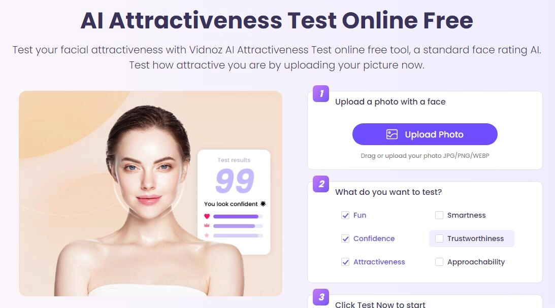 Vidnoz offers an AI face rater tool to help you test how attractive, confident, smart, trustworthy, etc., you are. By just uploading your selfies and letting the AI take over all, it will analyze how attractive and charming you are.