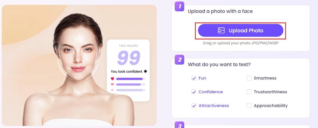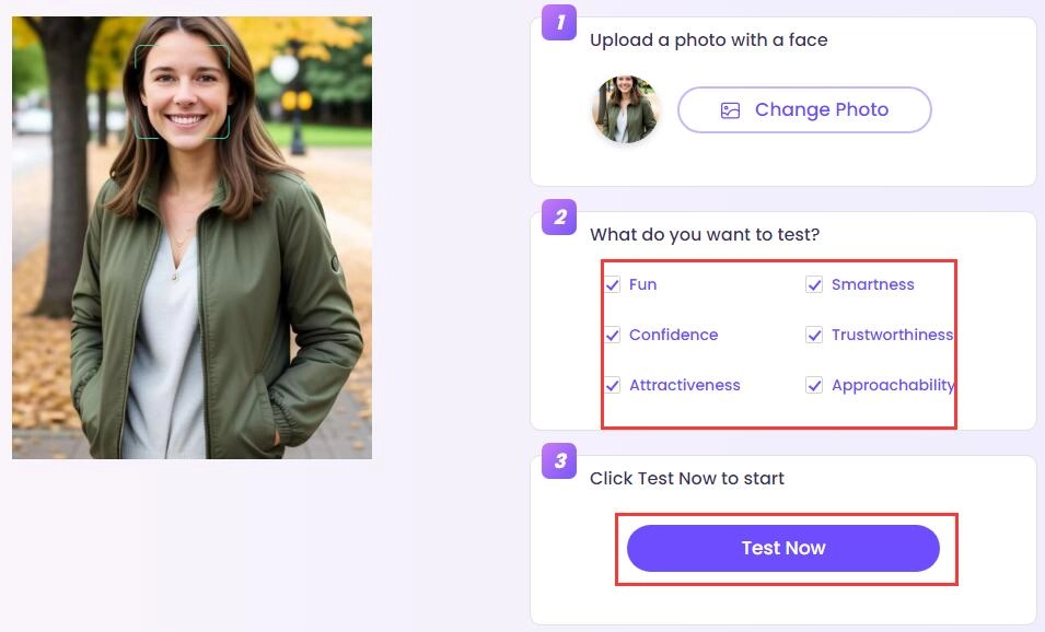 Step 2. Choose the face rating items like Fun, Confidence, Attractiveness, etc. Then click Test Now.