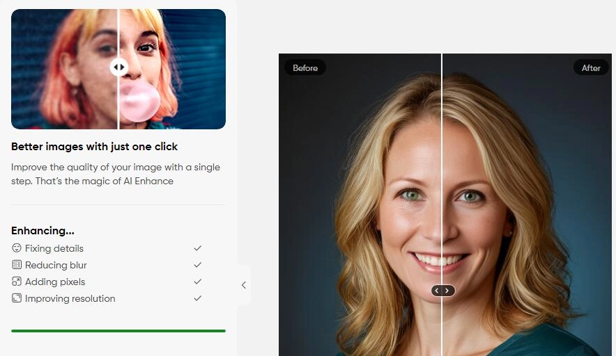 Though Picsart does not offer an exclusive eye bag eraser feature or function, it allows you to manually remove the eye bags with the editor. What’s more important, you can use its AI Enhance to beautify your selfies: it fixes the details, reduces blur, and adds more pixels to your picture.