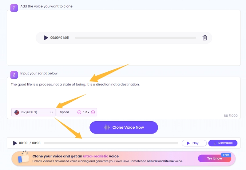 Similar to voice filter, AI voice cloning technology allows users to create a digital version of anyone’s voice, often with various tone settings, including deeper voice options. Tools like Vidnoz AI Voice Cloning tool enable voice cloning and modification to produce a preferred deep voice.