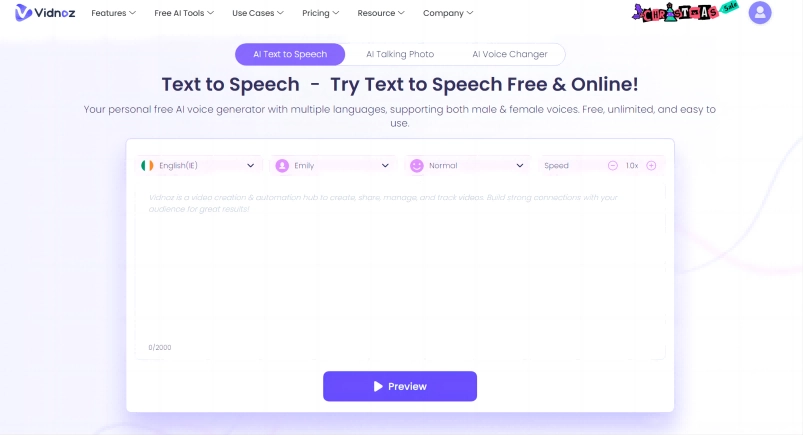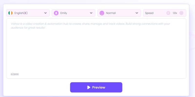 Vidnoz text to speech is a free text to speech tool provided by Vidnoz - AI powered video production tool that’s completely browser-based! This online text to speech tool can let users convert 5000 characters max, which benefits those who want to tell long stories. Moreover, If you are looking for an AI tool to support your work through narrations and audio clips, Vidnoz should be your first pick. The voices are fantastic and everything within the platform seamlessly blends when in action. Users can even convert their audio into professional videos if needed! From creating presentations, and webinars to entire marketing campaigns, Vidnoz does it all.