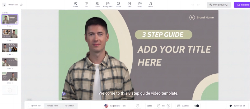 Customize the template by choosing a talking avatar, then at the language bar choose “English (IE)” then enter the text.
