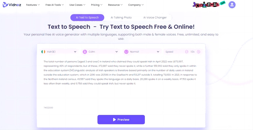 Vidnoz Text to Speech - Turn Text into Irish Accent Voiceovers Completely Free