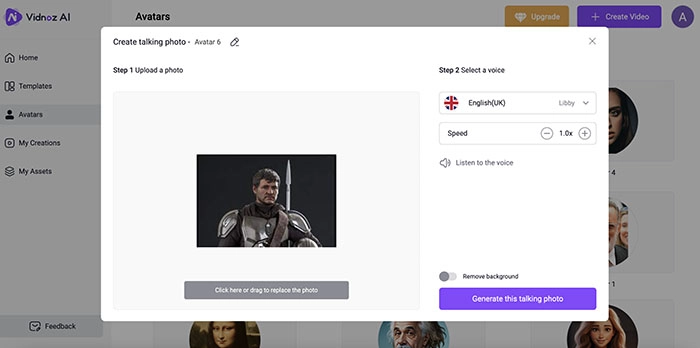 Step 2. In the library, go to Avatars > Upload your photo. Upload a Mandalorian avatar and click on the Generate this talking photo.