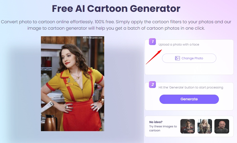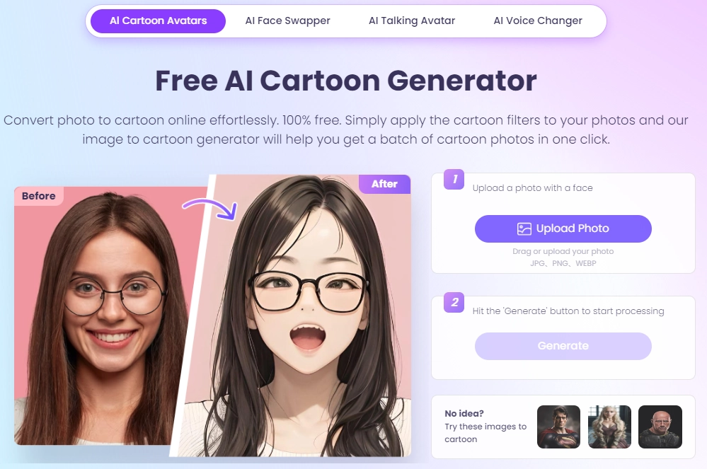 Vidnoz Cartoon Generator is listed as the top 1 AI caricature generator online, which can easily unleash all your imagination of photo to caricature creation. By just uploading your target photo (JPG、PNG、WEBP), like a selfie, movie character, etc., it will simply apply dramatic cartoon filters to your photos in seconds. Besides, you can get a batch of caricature photos in one click.