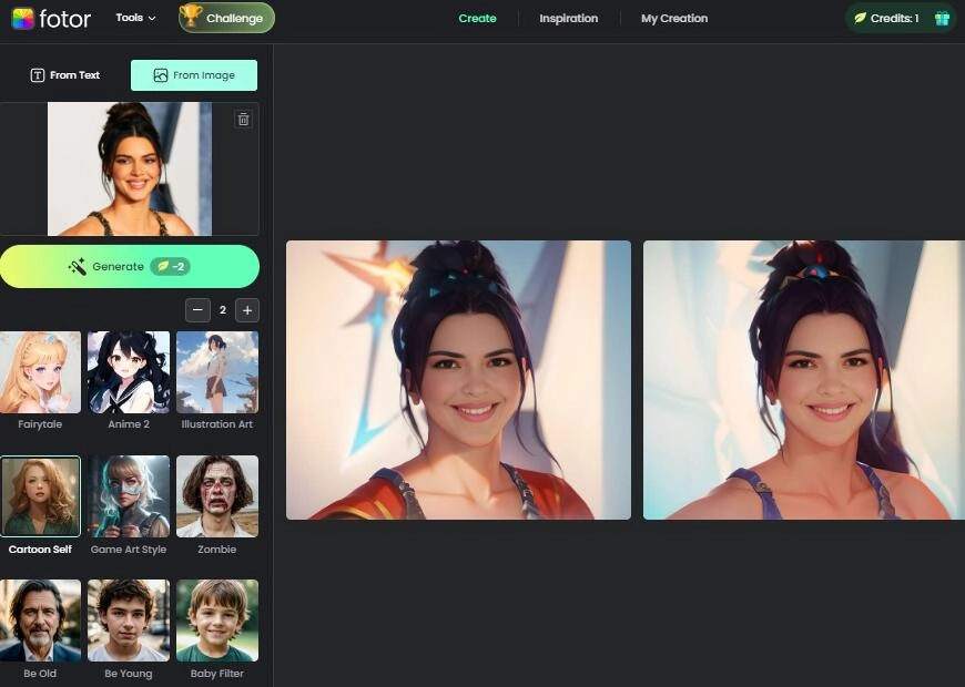 Step 3. Fotor offers you a lot of photo styles to choose. You can choose to cartoonize yourself. Click Generate and you can get dramatic caricature AI of yourself.