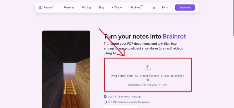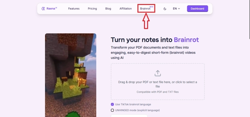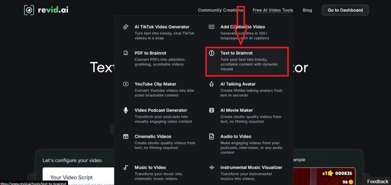 Step 1: Sign in to Revid AI and go to the “text to brainrot” page.