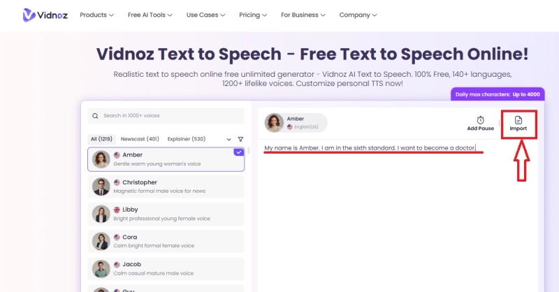 Vidnoz text to speech feature allows users to convert plain text into clear speech using AI voices. Vidnoz offers 1200+ realistic male and female voices in 140+ languages with a clear tone.