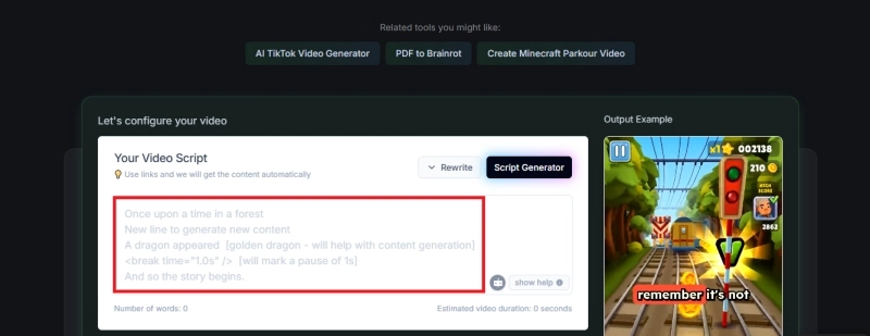 To use this AI brianrot video generator text to speech, follow these simple and easy steps.