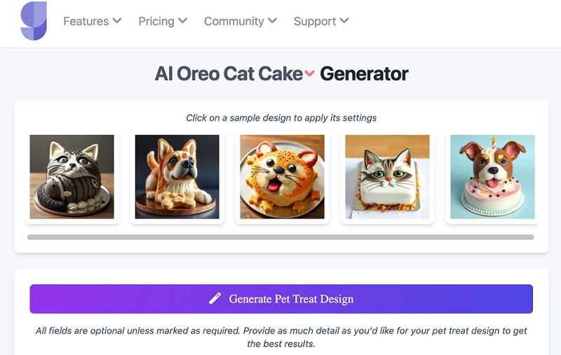 The AI Oreo Cat Cake Generator by GizAI is a niche tool that caters to pet-themed baking and quirky dessert visuals. It's especially popular among pet lovers who want to design cakes featuring their cat or dog, often with playful Oreo or snack-inspired themes. While it’s not your typical cake generator, it adds a fun twist for more personal or themed occasions.