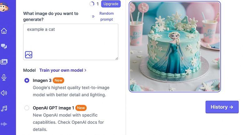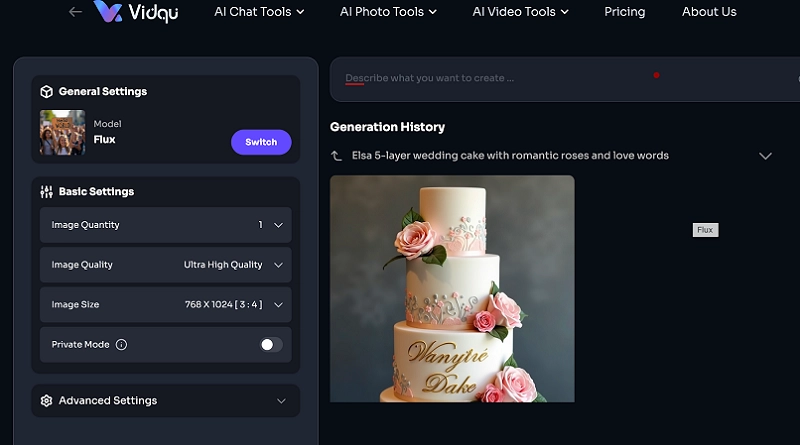 Vidqu is another excellent choice for creating realistic or artistic cake visuals. What sets this AI birthday cake generator apart is its ultra-high-definition output that you can get even on the free plan. You can explore different AI models to get varied interpretations of your prompt, and that is not it - the platform also allows private sessions so your ideas remain confidential. It’s ideal for users who need clean, detailed cake images without watermarks.