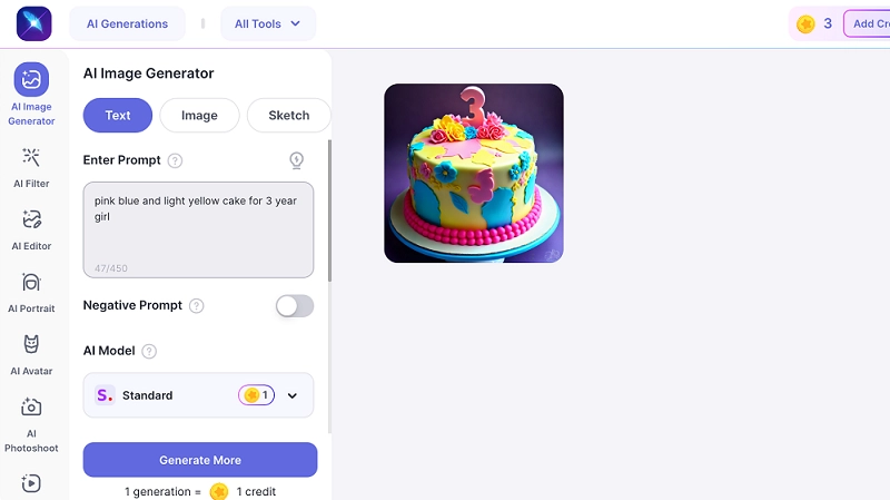 - Refine your prompts with more details: Include cake type, theme, colors, size, and occasion. The more specific your input, the more accurate your cake image will be.