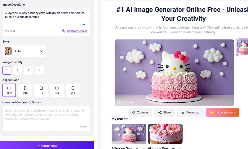 Vidnoz AI image generator is a powerful and easy-to-use tool that works well for cake designs. You simply type in a prompt—like “whimsical rainbow unicorn cake with sprinkles”—and it delivers clean, high-resolution AI generated cake in various art styles. This AI cake generator free supports multiple aspect ratios and also allows you to exclude certain elements, which is helpful when you're refining a concept.
