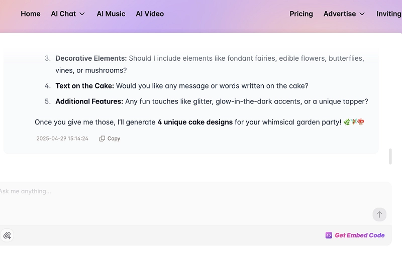 - AI chatbot suggests cake design ideas and detailed prompts