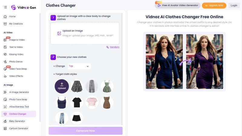 Vidnoz AI Clothes Changer is a 100% free online AI outfit generator enabling users to try various clothes virtually. Its user-friendly interface, expansive fashion library, and seamless experience make Vidnoz Clothes Changer a go-to destination for experimenting with new styles.