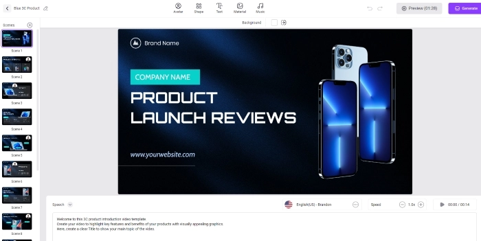 The AI-generated business video can express your company idea exactly as you wish. Just type the script you want to say in the Vidnoz AI speech bar, it will match the words with the talking avatars in seconds. Furthermore, there are 23+ languages and 100+ voices to choose from.