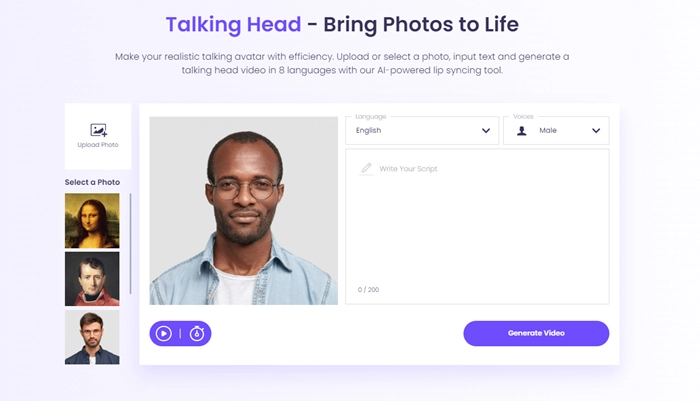 Step 2. Vidnoz Talking Head freely offers you some sample avatars, you can instantly input texts and let the avatars speak for you.