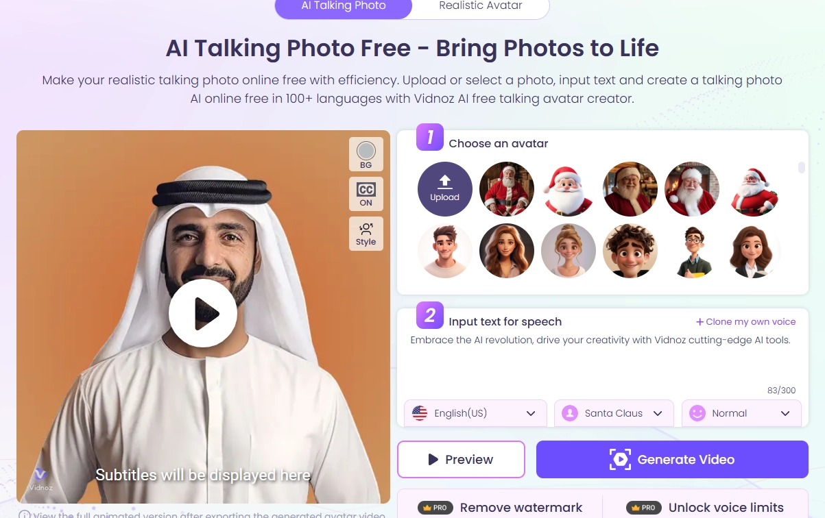 If you use an AI religious art generator to create lifelike religious characters, you can take it a step further by making them talk. Vidnoz AI Talking Photo can detect lips and use lip-syncing technology to create natural lip movements. You can then add a text-to-speech voiceover, allowing you to make the character's dialogue funny, serious, or anything in between.