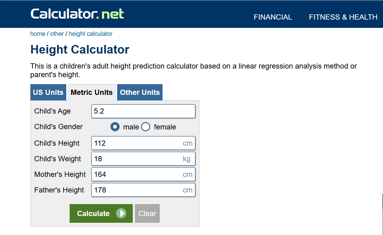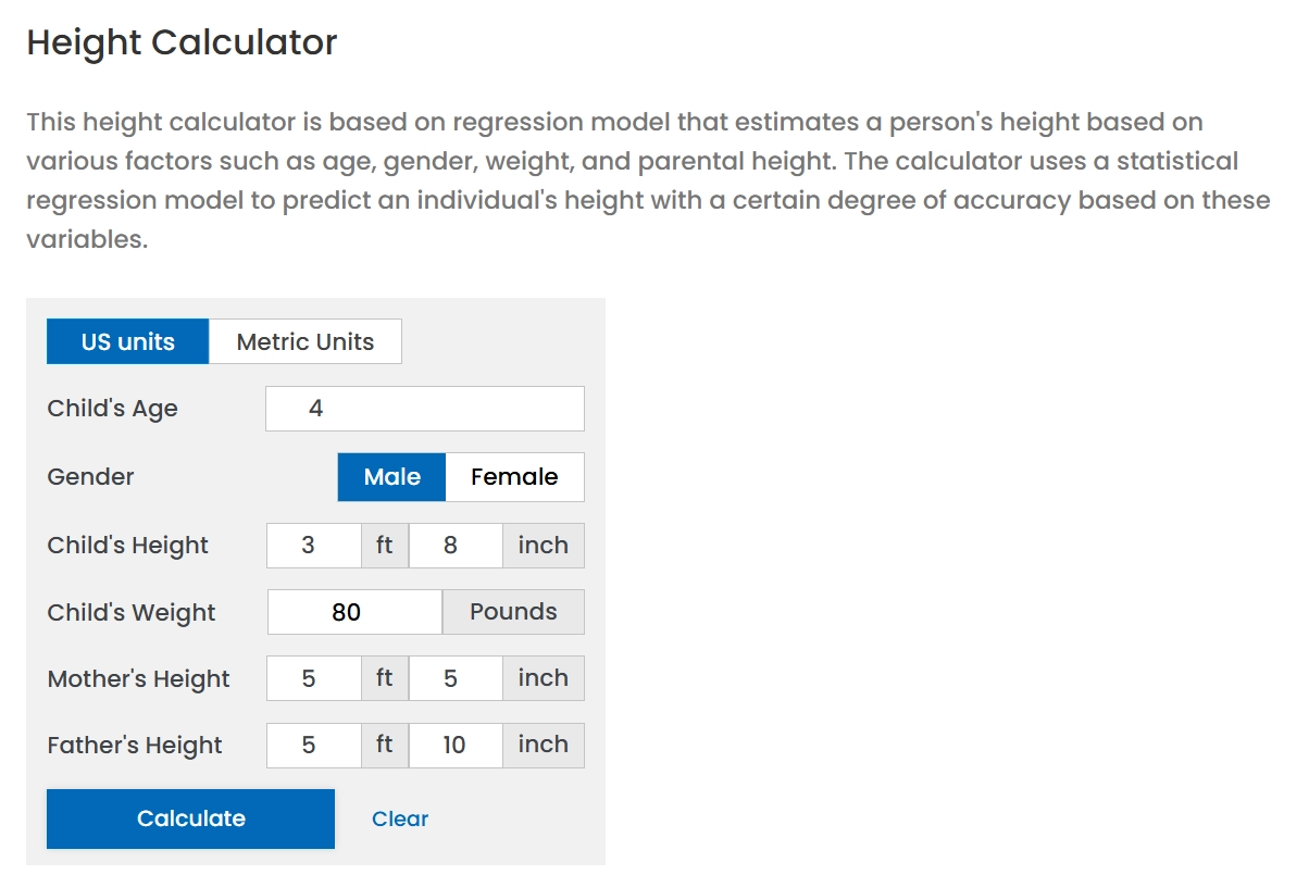 The height calculator AI from Calculator.net offers height predictions based on parental heights with a linear regression method. Apart from height, the site features other online calculators such as: age, grade, time, and bra size calculators.
