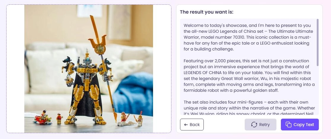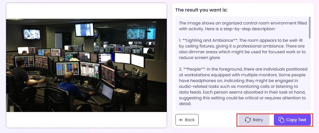Step 3. In a few seconds to minutes, you will get a thorough analysis of your image. Check how the text description is, retry, and copy text as you need.