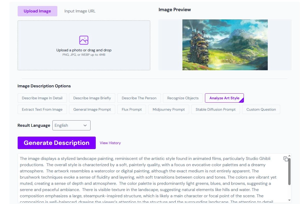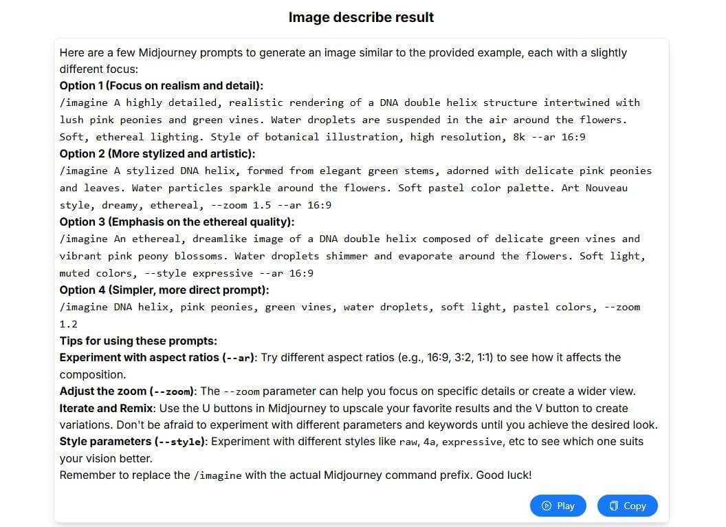 Suitable for artists, this AI auto image description generator also allows users to convert photo to prompt for AI art creators like Midjourney, Stable Diffusion, Flux, etc.