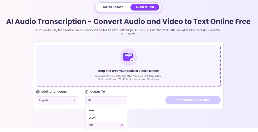 Vidnoz AI Audio Transcription is a tool that can turn your meeting recordings (audio and video) into easy-to-read texts. You can upload your recordings, and it works by analysing and understanding the files quickly and creating clear notes in various formats, such as TXT, JSON, and SRT files. Besides, it supports 30+ language translations, so you can create AI meeting notes for your global colleagues to enhance collaborations.