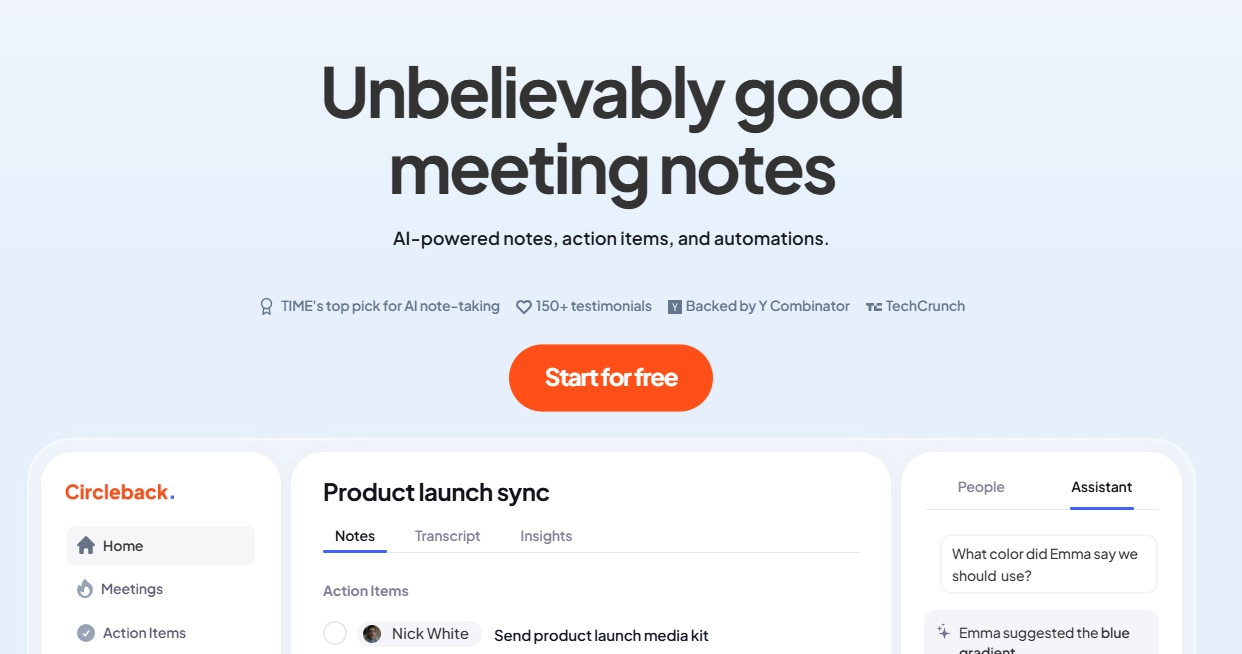 Circleback is an easy AI meeting notes tool. With Circleback, you can effectively transcribe meeting audios and convert them into organized notes. Generally, it works as other AI meeting note takers, but it stands out for the automated task assigning feature. So you can focus on thinking and interacting with your team.