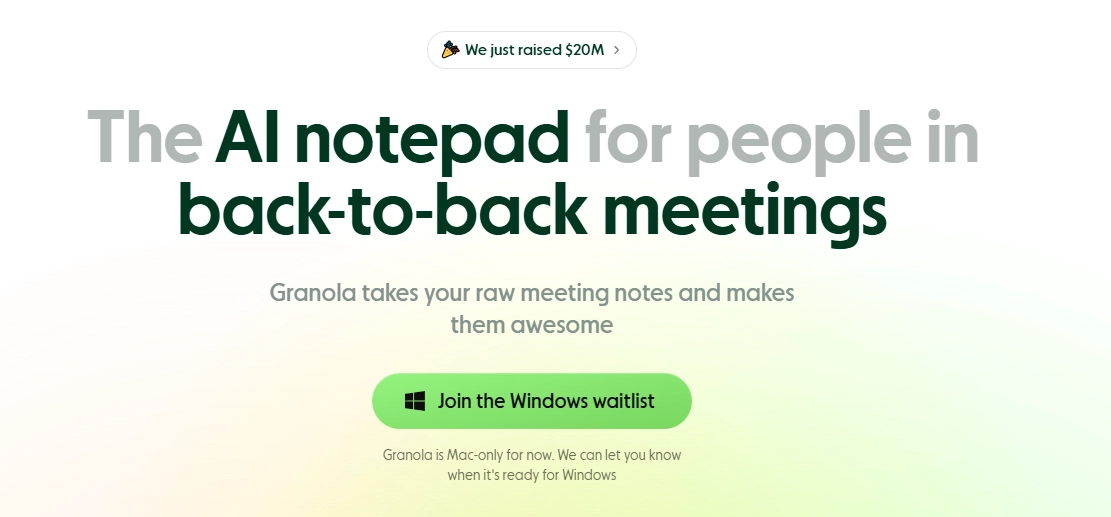 Granola is an AI notetaker designed to simplify note-taking and inspire you during back-to-back meetings. It works by listening when you talk, transcribing audio to texts, and making everything neatly organized. Besides, you can just add your own thoughts when ideas come to you, then this meeting note AI will automatically combine your insights with the notes it transcribed.