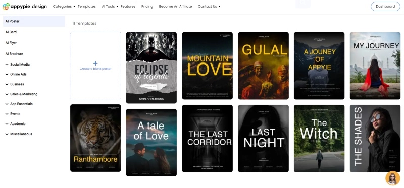 The appypie movie poster maker is an Indian-based website with all the necessary features required to make a movie poster. You provide a prompt, and appypie will create a movie poster for you with the selected dimensions (aspect ratio).
