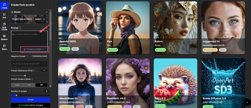 Step 2: Enter Prompt in the prompt box. You can enhance your prompt with the AI tool within the prompt box by using one credit.