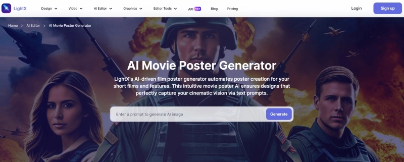 With LightX, you can either create a poster from scratch using prompts or you can customize the already existing templates with provided prompts. This AI poster generator offers a wide range of movie poster art styles from vintage, modern, to sci-fi, 3D and more. The resulting posters have bright colors and high contrast, making them very vivid to look at. In addition, LightX provides a mobile application specifically for iOS and Android users.
