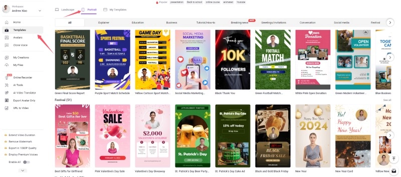 Step 2: You will be redirected to the Home page of Vidnoz AI tool. Now click the Template option in the left sidebar. Then click on the Portrait option at the top of the page and choose a template you like to start creating AI movie posters.