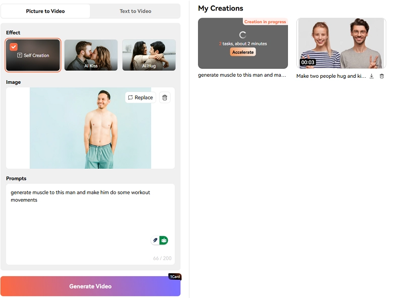 Vibro is an AI muscle generator free tool that provides an option to generate AI muscle visuals for a photo and turn it into a muscle AI video if needed. There is no preset muscle AI video effect, so you can choose self-creation, import your photo, and illustrate your demand for turning the figure into a muscular via detailed text descriptions.