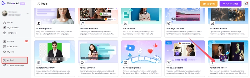 Step 1. Go to Vidnoz AI > Sign in > On its panel, click the AI Tools > AI Dancing Photo.
