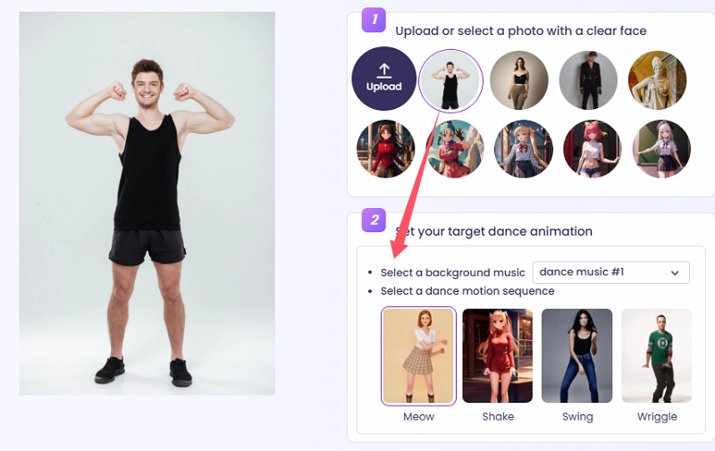 If it is not your final vision to generate a normal muscle AI video, you can try the Vidnoz AI Dance Photo tool. It is a completely free game changer that can add a funny dance motion sequence to a full-body photo. And the dance choices include Meow, Shake, Swing, and Wriggle.