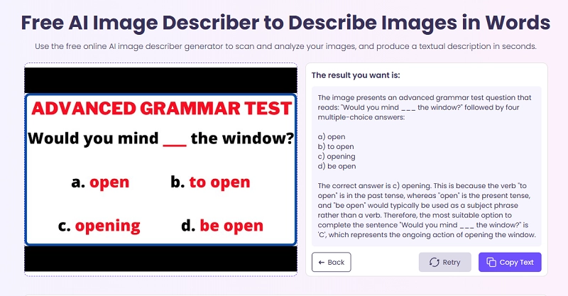 Whether you're dealing with complex academic problems, data charts, or a product photo, this tool can analyze and describe the image content, extract the text, and even solve visible problems within the image.