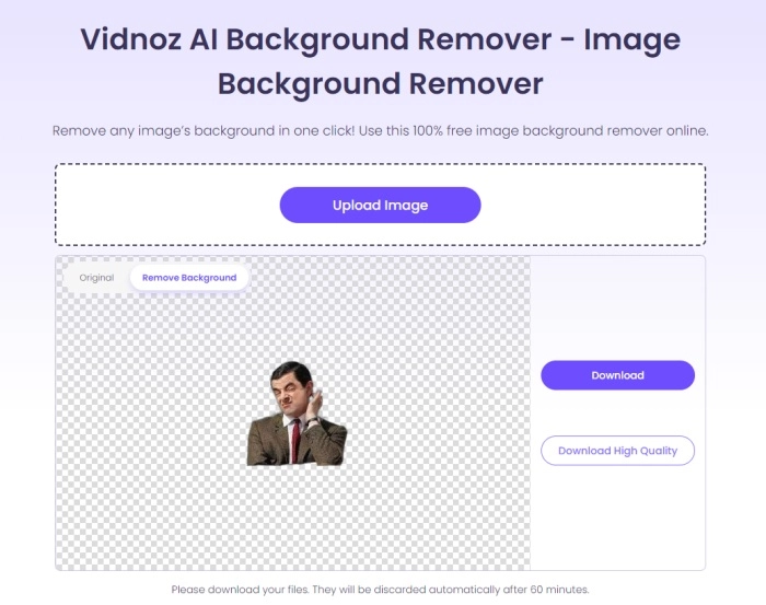 Step 2. Access Vidnoz AI Background Remover. Click Upload Image or simply drag and drop the image in the box. Now you can wait for this AI tool to work for you.