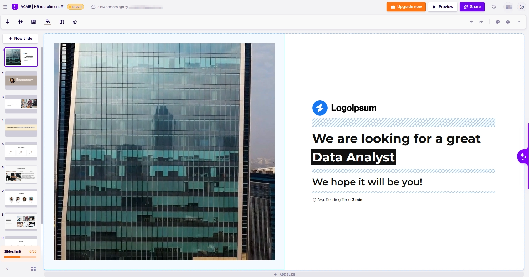 Slidebean, a pitch deck creator designed to simplify and enhance deck creation. You can trial the free version first, type the company site or add the company description, then it will analyze and generate a multi-page pitch deck soon. But frankly speaking, the generated pitch deck is quite normal, in other words, you may need to alter a lot to make it unique. Moreover, the free version is a bit limited in terms of features. Some other useful features like expert consultation, pick deck writing and design services are paid add-ons.