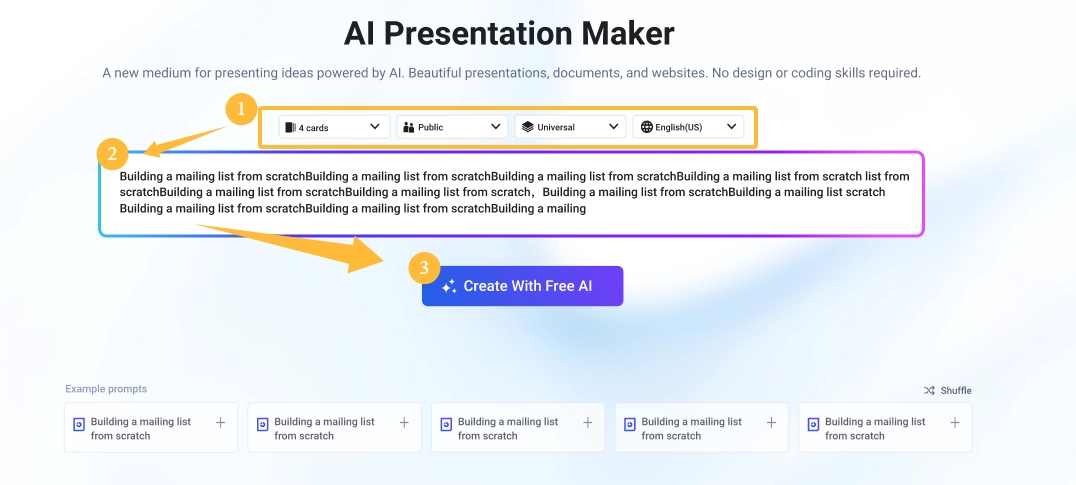 Step 2. Set your slides number, tone, language on the main page, and describe what you intend to make. Click the Create with Free AI button to proceed.