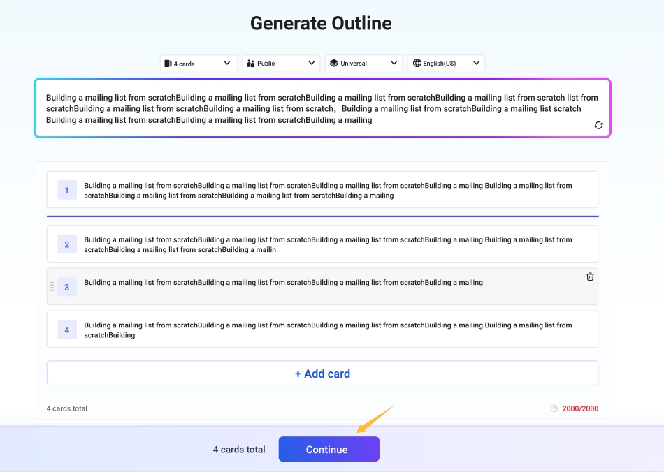 Step 3. Detail each slide content or click +Add Card to increase slide if necessary. Click Continue to navigate to the editing page.