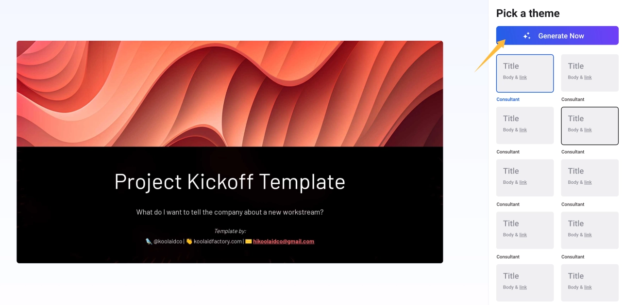 Step 4. Edit each template depending on your specific needs. Once you think it’s perfectly done, click Generate Now on the top right corner to export your pitch deck.